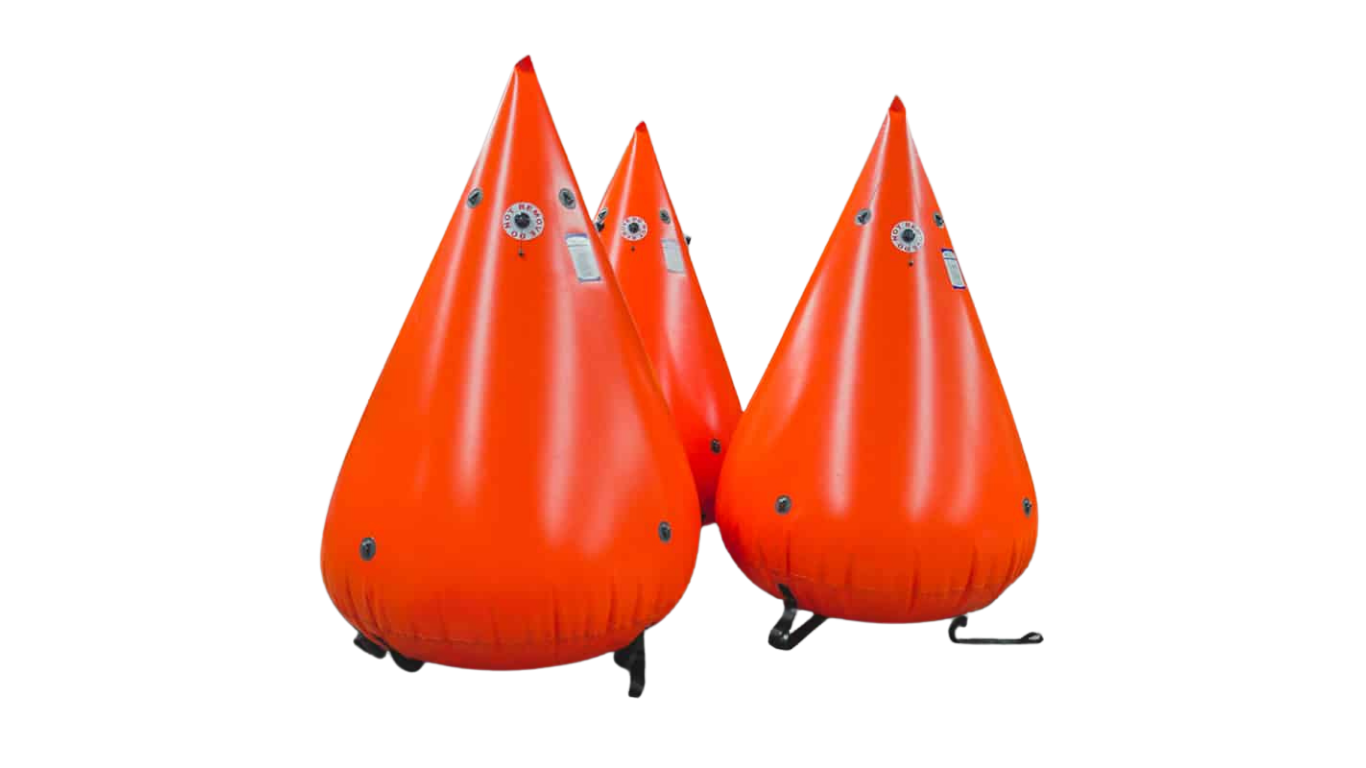 Each buoy comes fitted with a standard inflation valve and an over‑pressure relief valve (1.5 psi working pressure), making setup quick and safe while allowing the buoy to adapt to changing environments. For secure anchoring, every unit includes welded tie‑points and heavy‑duty stitched webbing straps on the base, making attachment to weights or anchors simple and dependable.